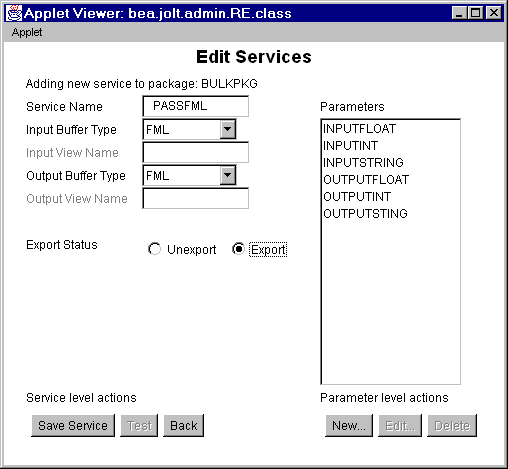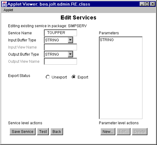 withdrawal = new JoltRemoteService("WITHDRAWAL", session);deposit = new JoltRemoteService("DEPOSIT", session);These calls bind the service definition of both the WITHDRAWAL and DEPOSIT services, which are stored in the Jolt Repository, to the withdrawal and deposit objects, respectively. The services WITHDRAWAL and DEPOSIT must be defined in the Jolt Repository; otherwise a ServiceException is thrown. This example does not explicitly catch ServiceException errors.