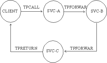 Refer to Defining a Service for a description of the TPTYPE-REC record. The primary function of a service routine is to process a request and return a reply to a client process. It is not necessary, however, for a single service to do all the work required to perform the requested function. A service can act as a requester and pass a request call to another service the same way a client issues the original request: through calls to TPCALL or TPACALL. Note: The TPCALL and TPACALL routines are described in detail in Writing Request/Response Clients and Servers. When TPRETURN is called, control always returns to the controlling program. If a service has sent requests with asynchronous replies, it must receive all expected replies or invalidate them with TPCANCEL before returning control to the controlling program. Otherwise, the outstanding replies are automatically dropped when they are received by the BEA Tuxedo system controlling program, and an error is returned to the caller. If the client invokes the service with TPCALL, after a successful call to TPRETURN, the reply message is available in the O-DATA-REC record. If TPACALL is used to send the request, and TPRETURN returns successfully, the reply message is available in the DATA-REC record of TPGETRPLY. If a reply is expected and TPRETURN encounters errors while processing its arguments, it sends a failed message to the calling process. The caller detects the error by checking the value placed in TP-STATUS. In the case of failed messages, the system sets the TP-STATUS to TPESVCERR. This situation takes precedence over the value of APPL-RETURN-CODE IN TPSTATUS-REC. If this type of error occurs, no reply data is returned, and both the contents and length of the caller's output record remain unchanged. If TPRETURN returns a message in a record of an unknown type or a record that is not allowed by the caller (that is, if the call is made with TPNOCHANGE), the system returns TPEOTYPE in TP-STATUS. In this case, application success or failure cannot be determined, and the contents and length of the output record remain unchanged. The value returned in APPL-RETURN-CODE IN TPSTATUS-REC is not relevant if the TPRETURN routine is invoked and a timeout occurs for the call waiting for the reply. This situation takes precedence over all others in determining the value that is returned in TP-STATUS. In this case, TP-STATUS is set to TPETIME and the reply data is not sent, leaving the contents and length of the caller's reply record unchanged. There are two types of timeouts in the BEA Tuxedo system: blocking and transaction timeouts (discussed in Writing Global Transactions). The example code in this section shows the TRANSFER service that is part of the XFER server. Basically, the TRANSFER service makes synchronous calls to the WITHDRAWAL and DEPOSIT services. It allocates a separate record for the reply message since it must use the request record for the calls to both the WITHDRAWAL and the DEPOSIT services. If the call to WITHDRAWAL fails, the service writes the message cannot withdraw on the status line of the form and sets TP-RETURN-VAL IN TPSVCRET-REC of the TPRETURN routine to TPFAIL. If the call succeeds, the debit balance is retrieved from the reply record. Note: In the following example, the application moves the identifier for the "destination account" (which is retrieved from the cr_id variable) to the zeroth occurrence of the ACCOUNT_ID field in the transf fielded record. This move is necessary because this occurrence of the field in an FML record is used for data-dependent routing. Refer to Setting Up a BEA Tuxedo Application for more information. A similar scenario is followed for the call to DEPOSIT. On success, the service sets the TP-RETURN-VAL IN TPSVCRET-REC to TPSUCCESS, returning the pertinent account information to the status line. TPRETURN Routine Invalidating Descriptors If a service calling TPGETRPLY (described in detail in Writing Request/Response Clients and Servers) fails with TPETIME and decides to cancel the request, it can invalidate the descriptor with a call to TPCANCEL(3cbl). If a reply subsequently arrives, it is silently discarded. TPCANCEL cannot be used for transaction replies (that is, for replies to requests made without the TPNOTRAN flag set). Within a transaction, TPABORT(3cbl) does the same job of invalidating the transaction call descriptor. The following example shows how to invalidate a reply after timing out. Invalidating a Reply After Timing Out Forwarding Requests The TPFORWAR(3cbl) routine allows a service to forward a request to another service for further processing. Use the following signature to call the TPFORWAR routine: For descriptions of the TPSVCDEF-REC and TPTYPE-REC records, refer to Defining a Service. The functionality of TPFORWAR differs from a service call: a service that forwards a request does not expect a reply. The responsibility for providing the reply is passed to the service to which the request has been forwarded. The latter service sends the reply to the process that originated the request. It becomes the responsibility of the last server in the forward chain to send the reply to the originating client by invoking TPRETURN. The following figure shows one possible sequence of events when a request is forwarded from one service to another. Here a client initiates a request using the TPCALL routine and the last service in the chain (SVC_C) provides a reply using the TPRETURN routine. Forwarding a Request