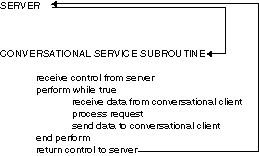 After initialization, an ATMI server allocates a buffer, waits until a request message is delivered to its message queue, dequeues the request, and dispatches it to a service subroutine for processing. If a reply is required, the reply is considered part of request processing. The conversational paradigm is somewhat different from request/response, as illustrated by the pseudo-code in the following figure. Pseudo-code for a Conversational Service Subroutine