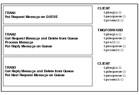 In the figure, the client starts a transaction, queues the message and commits the transaction. The message is dequeued within a second transaction started by TMQFORWARD; the service is called with tpcall(3c), is executed and the reply is enqueued within the same transaction. A third transaction, started by the client, is used to dequeue the reply (and possibly enqueue another request message). In ongoing processing, the third and first transactions can meld into one since enqueuing the next request can be done in the same transaction as dequeuing the response from the previous request. Note: The system allows you to dequeue a response from one message and enqueue the next request within the same transaction, but does not allow you to enqueue a request and dequeue the response within the same transaction. The transaction in which the request is enqueued must be successfully committed before the message is available for dequeuing. Handling Reply Messages A reply queue can be either specified or not by the application when calling tpenqueue(). The effect is as follows: