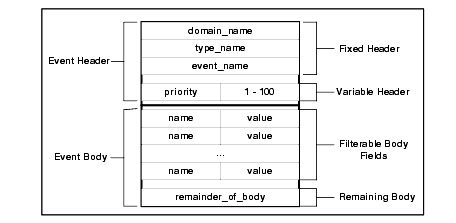 The Notification Service supports five levels of event design: (1) domain name, (2) type name, (3) priority, (4) filterable data, and (5) remainder of body. When designing an event, you must specify a domain name and a type name; priority and filterable data are optional. The domain name you choose can relate to your business. Hospitals, for example, are in the health care business, so for a Notification Service application for a hospital you might choose "HEALTHCARE" as a domain name. You might want to categorize the events by the type of insurance provider, so you may choose "HMO" or "UNINSURED" as the type name. You may want to further define the events by the entity responsible for payment, so you might choose to use the filterable data to identify the entity as "billing" for a specific "HMO_Account" or a specific or "Patient_Account." Listing 2-1 shows an example of this type of event design.