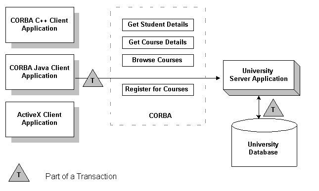 During the development process, you would define in Object Management Group (OMG) Interface Definition Language (IDL) the register_for_courses() operation for the Registrar. The register_for_courses() operation has a parameter, NotRegisteredList, which returns to the client application the list of courses for which registration failed. If the value of NotRegisteredList is empty, the client application commits the transaction.
