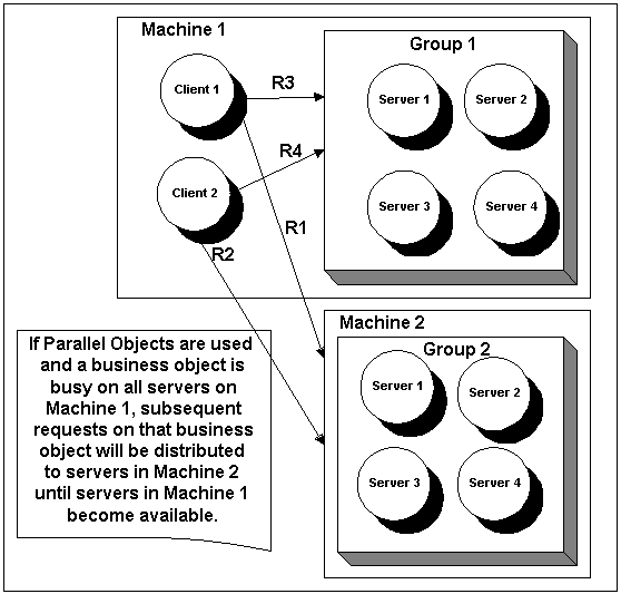 .As illustrated in Figure 1-1, if a stateful business object is active on a server on Machine 2, all subsequent requests to that business object will be sent to Group 2 on Machine 2. If the active object on Machine 2 is busy processing another request, the request is queued. Even after the business object stops processing requests on Machine 2, all subsequent requests on that stateful business object will still be sent to Group 2. After the object is deactivated on Machine 2, subsequent requests will be sent to Group 2 on Machine 2 and can be processed by other servers in Group 2.