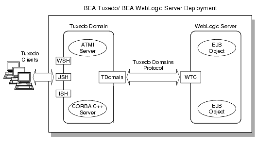 The TDomain and WTC gateways provide bidirectional connectivity between ATMI services/ CORBA objects deployed in a BEA Tuxedo application and EJB objects deployed in a WebLogic Server application. Together, the gateways allow the following interoperability for a BEA Tuxedo/ WebLogic Server deployment: