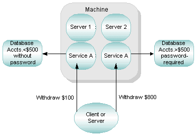 A customer uses a cash machine to transfer money from his or her savings account to her checking account. A BEA Tuxedo application performs the work necessary to transfer the money. First, on behalf of the customer, the client issues a request for a service called TRANSFER, and the request is placed on a queue for a server that provides that service. Next, the TRANSFER service requests two other services, WITHDRAW and DEPOSIT, which are processed by a second server. The WITHDRAW and DEPOSIT services return responses to the TRANSFER service. Finally, TRANSFER sends a response to the client's response queue. When the client retrieves the response from the queue, the system displays a message on the screen of the cash machine, notifying the customer that the transfer is complete.