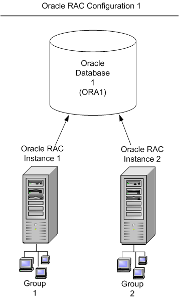 In this example, there is one Oracle database, (ORA1), two Oracle RAC instances with 1 group per each instance.