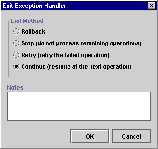 The Exit Exception Handler action sets the exception handler exit to Continue. This stops the execution of the exception handler and attempts to continue the execution of the workflow at the next operation (in this case, the action following the business operation that caused the exception). Figure 4-6 Exit Exception Handler Dialog Box