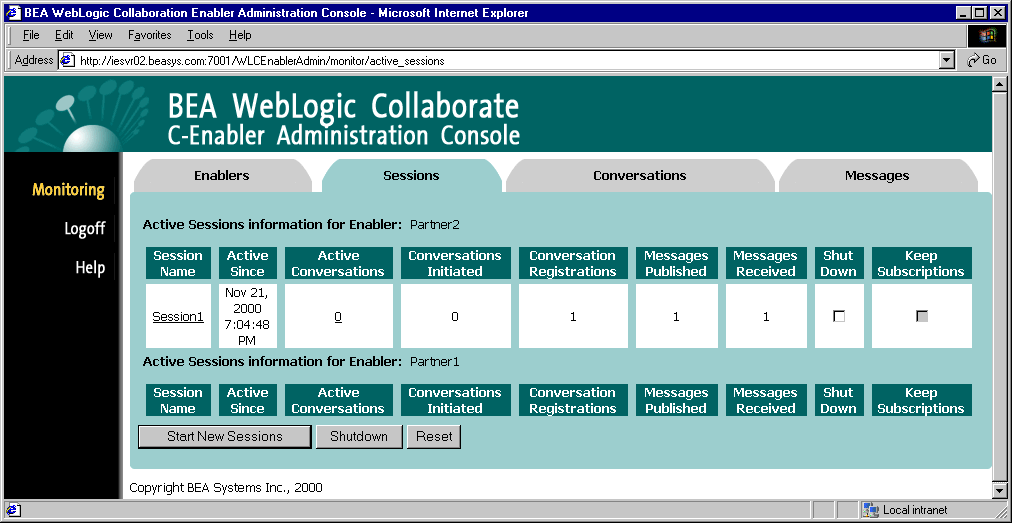 From the Sessions monitoring tab you can view information on active sessions, start new sessions, and shut down currently active sessions. These tasks are described in the following sections: