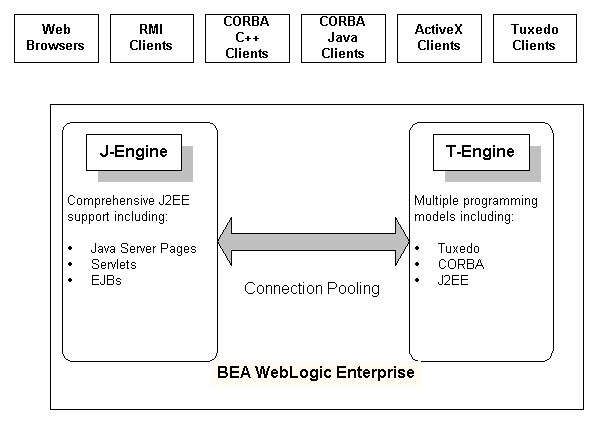 The T-Engine in the WebLogic Enterprise product is built upon the proven infrastructure provided in the BEA TuxedoTM product. The T-Engine delivers a scalable transaction platform with unparalleled choice of development and deployment options. Using the T-Engine, you can build integrated enterprise applications using multiple programming models. CORBA, J2EE, and Tuxedo applications can all be developed with fully integrated transaction management, security, administration, and reliability capabilities.