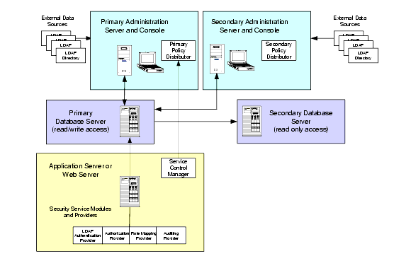 Most of the policy database used for security policy and for configuration administration and management is not replicated. The administration and management functions are performed against one and only one database. This means that the components such as the Administration Application, the Policy Distributor, and the Metadirectory Synchronization process are only connected to one database.