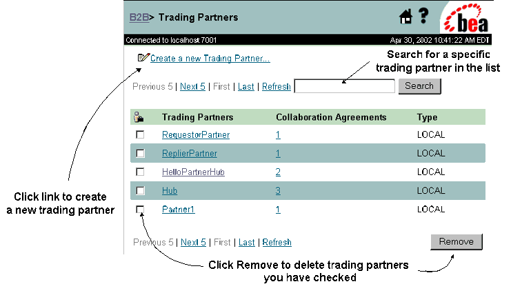 When you select the Trading Partners node from the navigation tree, the Trading Partners page is displayed in the right pane. This page shows a list of the currently defined trading partners, along with options for selecting, searching for, or removing an existing trading partner, and creating a new one.