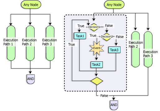 Note: In BPM, parallel paths are not executed concurrently. The same thread executes each path, progresses through one until it stops, then switches to a new path and works along that path until either all paths can no longer progress or all are ready for the And node. The choice of the starting path varies.