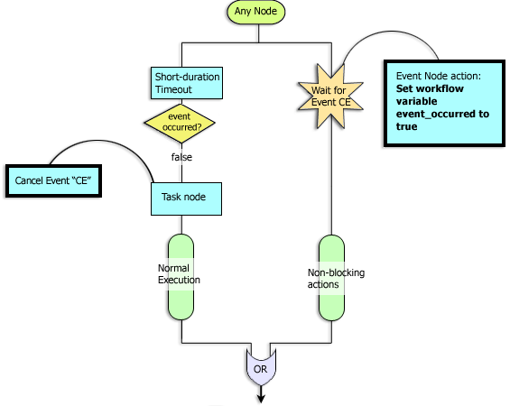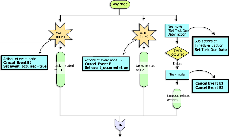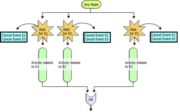 The Choice of Events pattern represents a case in which all the parallel paths coming out of a node wait for certain events to occur and the first event to occur determines which path will execute. (See Figure 4). Only one of parallel paths will ever execute depending on which event has occurred first. (All other paths are suppressed and will not fire). In order to guarantee mutual exclusion of the execution paths use the Cancel Event action as described in the following guidelines.