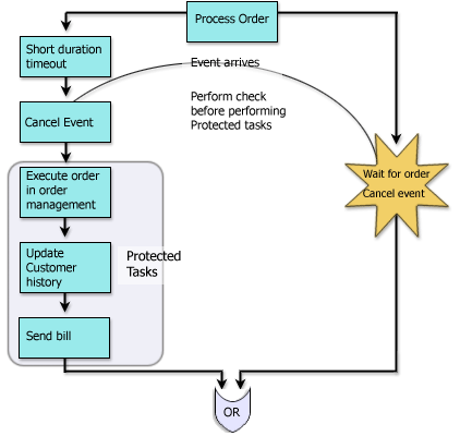 The All-or-Nothing variaton on a Cancel via Event is a pattern designed to check whether an event occured before proceeding to perform certain critical tasks. A simple example of this pattern can be seen in an order processing workflow (See Figure 7). The tasks in an order processing workflow might be as follows: