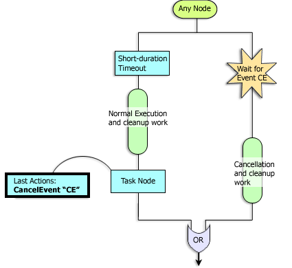 The Execution Timeout pattern may require a certain level of coordination between the normal execution path and the timeout path, in case the timeout is triggered. Moreover, complex cleanup logic may be required. (See the Cancellation via Event section for a related discussion.) It is up to you to implement the necessary workflow actions for cleanup. This section only gives the skeleton implementation of this workflow pattern.