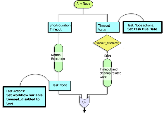 The Event with Timeout pattern represents a case where a set of mutually exclusive events are required to occur within a certain time frame or before a deadline. The first event that occurs before the timeout will run to completion, and other paths will be suppressed, including the timeout path. If, however, no events occur before the timeout, the timeout path is executed. Any event that occurs after the timeout will not trigger its corresponding execution path. Although the timeout logic can be implemented using either a Timed Event action or a Set Task Due Date action, the use of Set Task Due Date is recommended as it results in a cleaner, and easier-to-understand implementation. Figure 5 shows the proper implementation of this workflow pattern. For a description of best practices using Timed Event actions, see Event with Timeout.