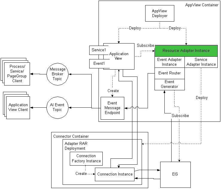 In WebLogic Integration 8.1, the event and service adapters are unified under the ResourceAdapter interface, and the adapter's implementation of that interface. It provides access to 0 or 1 event connection (created by the event adapter), and 0 or more service connections (sometimes referred to as connection factories, and created by the service adapter)