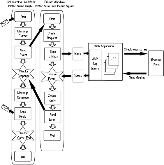 The collaborative and private customer workflows, PIP3A2_Customer and PIP3A2_Private_Customer, are the same as the workflows used in the RosettaNet example. The collaborative and private workflows, PIP3A2_Product_Supplier and PIP3A2_Private_Web_Product_Supplier, for the product supplier role are assumed to have been customized to support the XYZ Systems as a browser client.