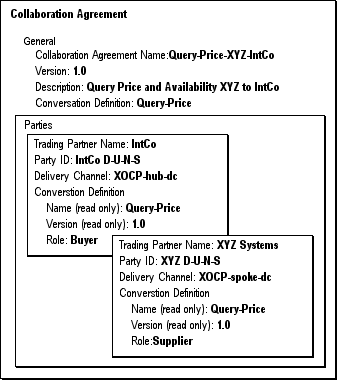 The conversation definition in the XYZ WebLogic Integration configuration is the same, with one exception: the value of the BPM organization (listed as WLPI organization) must be changed to reflect an organization defined at XYZ systems (for example, XYZ_Org). Collaboration Agreements The collaboration agreement shown in the following figure is required in both the ABC and XYZ WebLogic Integration configurations. Figure 1-25 Collaboration Agreement Query-Price-PIP3A2-ABC-XYZ