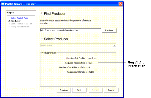 beaProducer in the Producer Handle field, as shown in Figure 4-6. This handle identifies the producer on the consumer.Checkpoint: At this point the WSDL data from the producer has been retrieved and is displayed in the Producer Details panel of the dialog, as shown in Figure 4-7. Note that four portlets on the producer are available to the consumer.