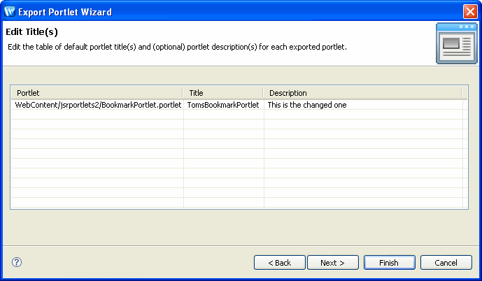 portlet.xml file. Click Next to continue. | Note: | A Title is required for each portlet. If any Title field is blank, the Next button is disabled until you supply a title. |