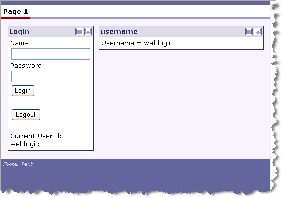 The portal shown in Figure 15-28 includes a local portlet on the left and a remote (proxy) portlet on the right. The remote portlet is deployed in an 8.1x producer. The local portlet is a login portlet. Before SAML security is properly configured, when a user logs in, the name that is returned is null.