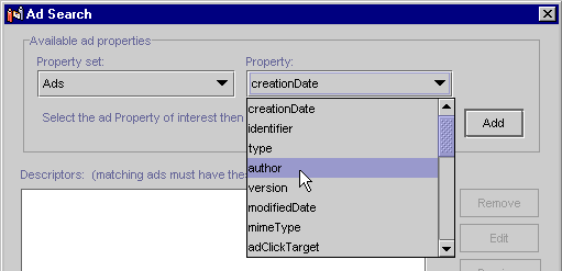 You select document properties in the Ad Search window or the Content Search window, depending on whether you are creating an ad placeholder, a scenario action for a campaign, or a content selector. The E-Business Control Center displays the Ad/Content Search window when you do any of the following: