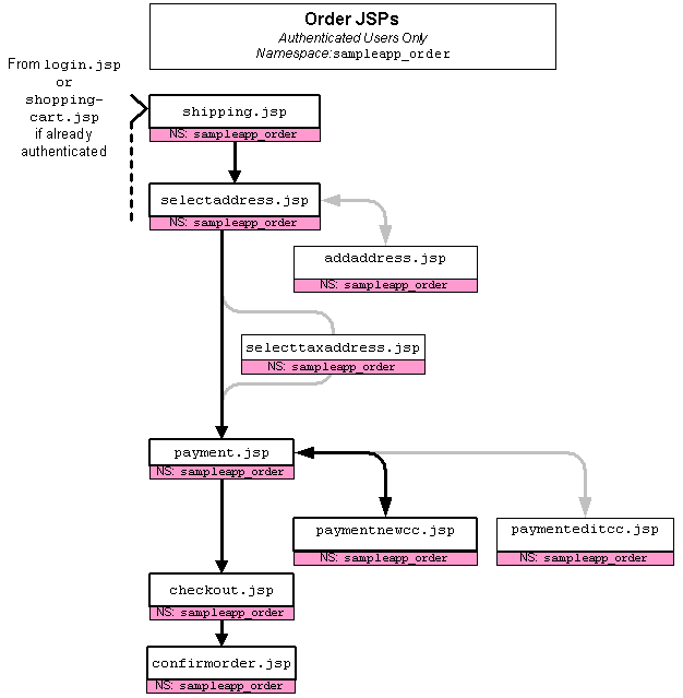 Webflow uses the three parent JSP pages to determine a user's context and to determine which pages to display after a user enters new credit card information. For example, Figure 3-16 shows that after a user completes paymentnewcc.jsp, Webflow displays payment.jsp; after a user completes profilenewcc.jsp, Webflow displays viewprofile.jsp, and after a user completes newuser.jsp, login.jsp is displayed.