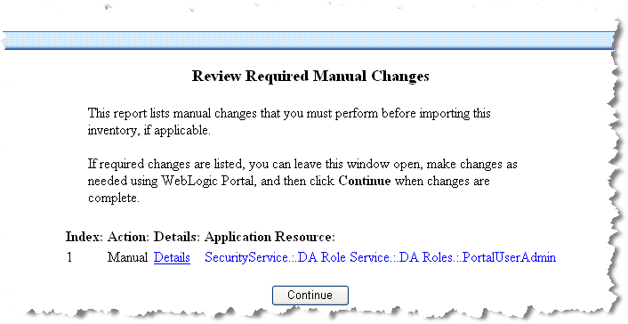 If required changes are listed, you can leave the Propagation Utility window open, make changes as needed using WebLogic Portal, and then come back to this page and click Continue when changes are complete.