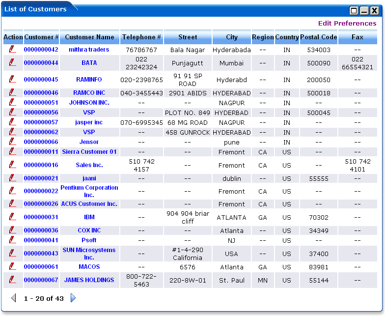 The second part can be categorized as the actions that can be performed for List of Customers Portlet. Action buttons available are: Edit (Customer Information like address etc.,), Maximize, Minimize, and Close. Edit preferences for the List of Customers Portlet.