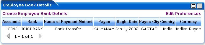 Click Edit Preferences hyperlink, from the Employee Bank Details Portlet, a screen, as illustrated, in the following figure is displayed: