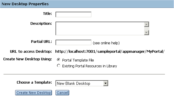 | Create New Desktop Using (radio button) | Existing Portal Resources in Library |