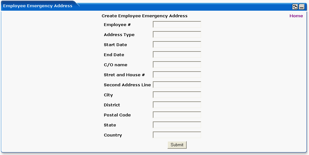 Click on Home hyperlink, to quit from the WebLogic Portlets for SAP HRMS - Employee Emergency Address entry screen, and return back to Employee Emergency Address Portlet.