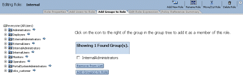 Click the checkbox next to InternalAdministrators, and click Add Groups(s) to Role. InternalAdministrators has now been added to the Internal Delegated Administration role, and its arrow icon has been removed in the tree.