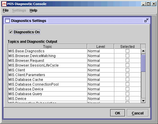 The diagnostic output can be broken down into a series of `topics', where each topic relates to a different area within the MobileAware Interaction Server, such as session management, cookie handling, device management or the transformation engine.