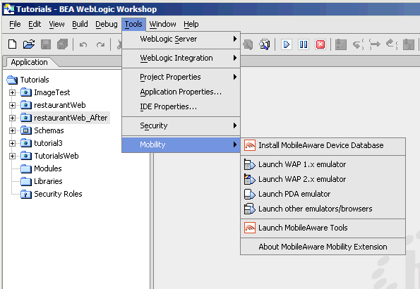 The MobileAware Interaction Server, BEA WebLogic Edition installation includes the Mobility Extension for BEA WebLogic Workshop. With the Mobility Extension, the BEA WebLogic Workshop Integrated Development Environment can be used for creating multi-channel applications and extending existing applications to support wireless devices. Please see the section "The Mobility Extension for BEA Workshop" for a description of the functionality provided by the Mobility Extension. The BEA Sample Workshop Mobility Project Guide provides a hands-on tutorial that uses the Mobility Extension features.