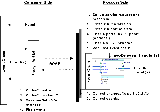 To facilitate interportlet communication with events, WebLogic Portal extended the WSRP protocol to add a third phase in the remote portlet life cycle. This extension allows a portlet to fire an event during its interaction phase. You can register events with remote portlets; however, when a proxy portlet receives an event, it cannot process it locally because it is a proxy. The remote portlet must send the event to the producer for processing. The portlet on the producer then fires the event and the producer handles it as appropriate.