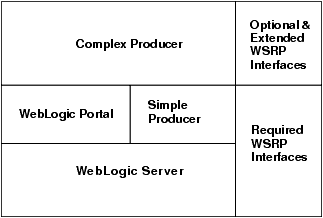 <registration required> element in the /WEB-INF/wsrp-producer-config.xml file to false. <portlet-management required> element to false in the file /WEB-INF/wsrp-producer-config.xml. A complex producer includes the required WSRP interfaces, optional interfaces, and some extended interfaces. A simple producer implements the required interfaces. A complex producer requires WebLogic Portal, but a simple producer can be deployed in a basic WebLogic Server domain. Figure 3-3 illustrates these relationships.