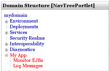 The Domain Structure portlet (NavTreePortlet) contains a tree control that you can use to navigate to content in the Administration Console. Each node in the tree is a link to a UI page control. Nodes can also contain subnodes.