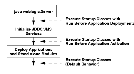 The following figure summarizes the time at which WebLogic Server executes startup classes.
