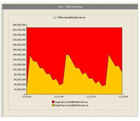 Each chart contains a legend, labels, and controls for identifying and displaying the data. A chart can display data from one or more data sources from one or more servers in the domain. The data sources include one or more metrics (that is, the value of an MBean instance attribute) or one or more instrumented methods. Each data source is displayed as a distinct graph, which shows the values of data points over a time span. The relationship between views, charts, and graphs is shown in Figure 3-4. In the figure, the view contains two charts, “WLDF Metrics Chart” and “JVMRuntime@MedRecServer,” based on metrics data from the MedRecServer server. “WLDF Metrics Chart” contains one metrics graph, “UpTime@MedRecServer.” The “JVMRuntime@MedRecServer” chart contains two metrics graphs, HeapSizeCurrent@MedRecServer” and “HeapFreeCurrent@MedRecServer.”