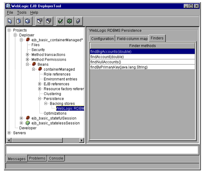 The WebLogic Server DeployerTool provides a graphical interface that Application Assemblers can use to deploy EJBs to one or more WebLogic Servers. DeployerTool simplifies the process of configuring EJB deployment properties and mapping EJB references to actual resource factories, roles and other EJBs available on a server.