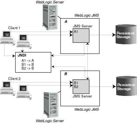 The WebLogic JMS architecture implements clustering of multiple JMS servers by supporting cluster-wide, transparent access to destinations from any server in the cluster. Although WebLogic Server supports distributing JMS destinations and connection factories throughout a cluster, JMS Queues and Topics are still managed by individual WebLogic Server instances in the cluster. For detailed information about WebLogic clustering, see the Using WebLogic Server Clusters.