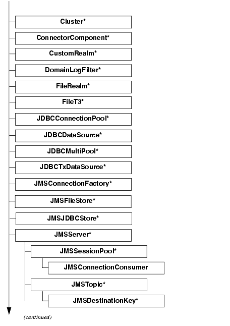 The config.xml file consists of a series of XML elements. The Domain element is the top-level element, and all elements in the Domain are children of the Domain element. Child elements may have children themselves. For example, the Server element contains the SSL, ServerStart, Log, WebServer, and ExecuteQueue child elements.