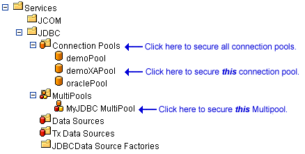 To secure all the connection pools with a single security policy, right-click Connection Pools. To secure a particular connection pool, expand Connection Pools, then right-click the name of a connection pool. To secure individual MultiPools, expand MultiPools, then right-click the name of a MultiPool.