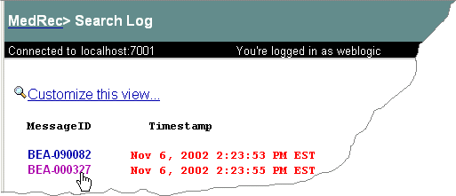 A unique six-digit identifier. All message IDs that WebLogic Server system messages generate start with Your applications can use a Java class called |