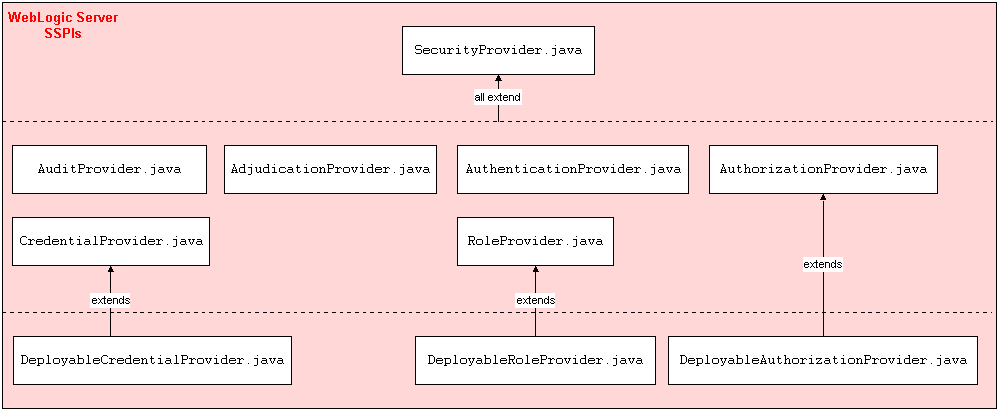 Implementations of SSPIs that begin with the prefix "Deployable" and end with the suffix "Provider" (for example, DeployableCredentialProvider) expose the services of a custom security provider into the WebLogic Security Framework as explained in Understand the Purpose of the Provider SSPIs. However, implementations of these SSPIs also perform additional tasks. These SSPIs also provide support for security in deployment descriptors, including the servlet deployment descriptors (web.xml, weblogic.xml), the EJB deployment descriptors (ejb-jar.xml, weblogic-ejb.jar.xml) and the EAR deployment descriptors (application.xml, weblogic-application.xml).