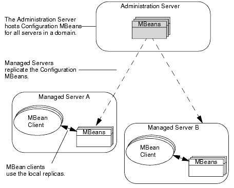 To enhance performance, each Managed Server creates local replicas of all Configuration MBeans in a domain. WebLogic Server subsystems and applications that interact with MBeans use the replicas on the local server instead of initiating remote calls to the Administration Server. (See Figure 1-2.)