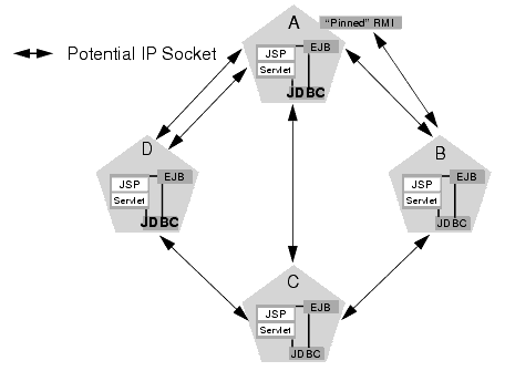 In this example, each server instance can potentially open a maximum of three sockets at a given time, to accommodate HTTP session state replication and to access the pinned RMI object on Server A.