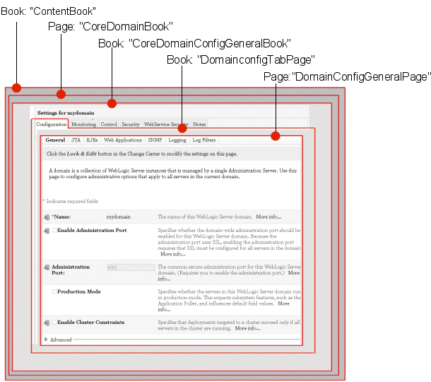 In Figure 2-4, a page named CoreDomainBook contains a book named CoreDomainConfigGeneralBook. The CoreDomainConfigGeneralBook contains six child books and a special UI control named singleLevelMenu that renders a tab for each child book (Configuration, Monitoring, Control, Security, WebService Security, and Notes). In turn, each child book (such as DomainconfigTabPage) contains several child page controls and the singleLevelMenu control. The Look and Feel causes the singleLevelMenu control to generate subtabs for the page controls at this level (General, JTA, EJBs, Web Applications, SNMP, Logging, and Log Filters).